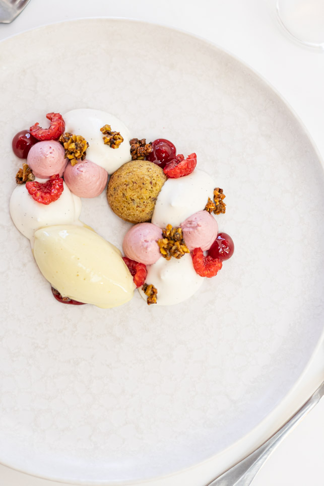 Crème montée au Cognac VS, pruneaux d’Agen macérés, feuille de meringue, gel de vinaigre balsamique blanc et sorbet aux pruneaux et au cognac